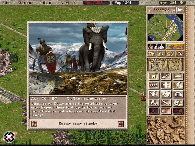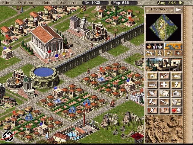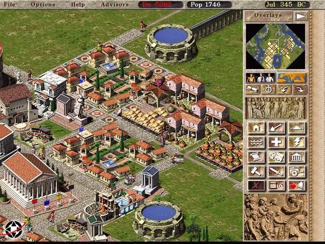 Cities in Caesar III try to accurately reflect the life of Roman citizens- the lowest plebs live in tents and shacks, while the richest patricians live in villas. Staple foods include wheat, fruits, and pork, and wine is required for some festivals and houses. Citizens wander the streets in their various garbs and can tell the player their name and how they feel about the city.